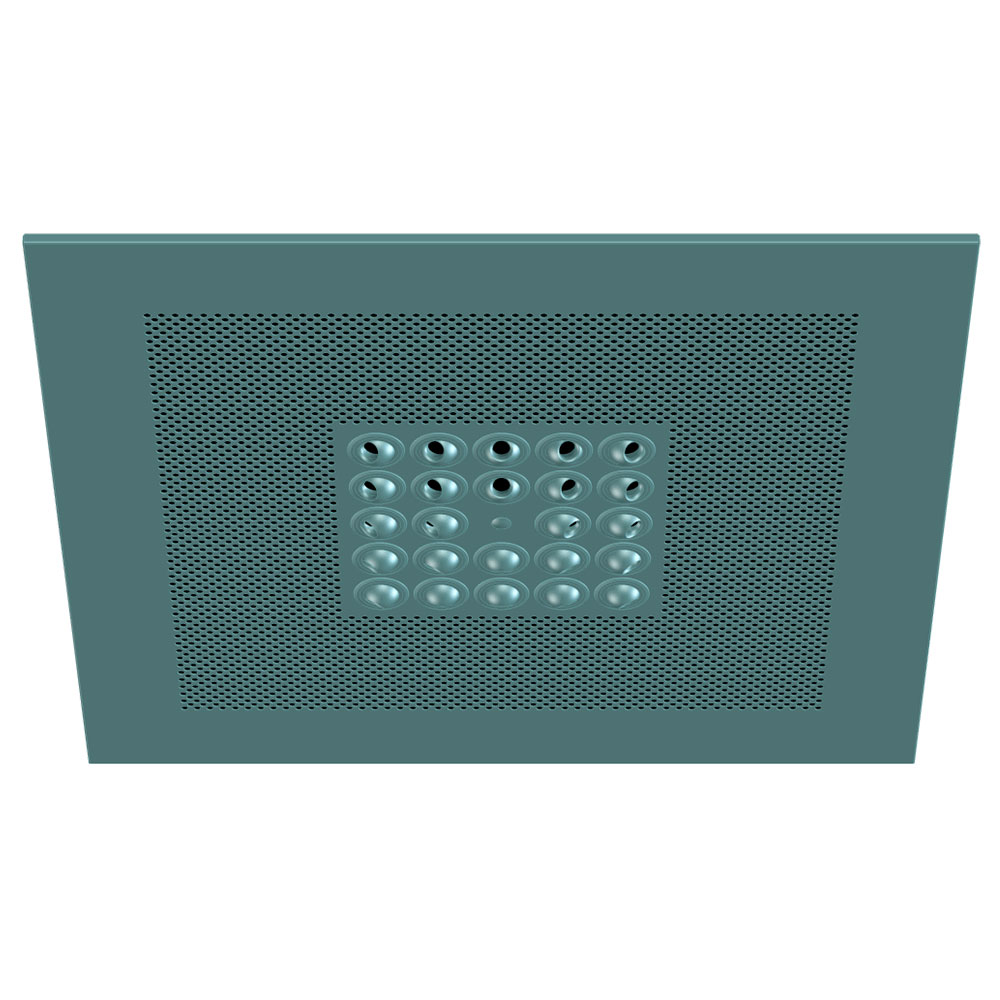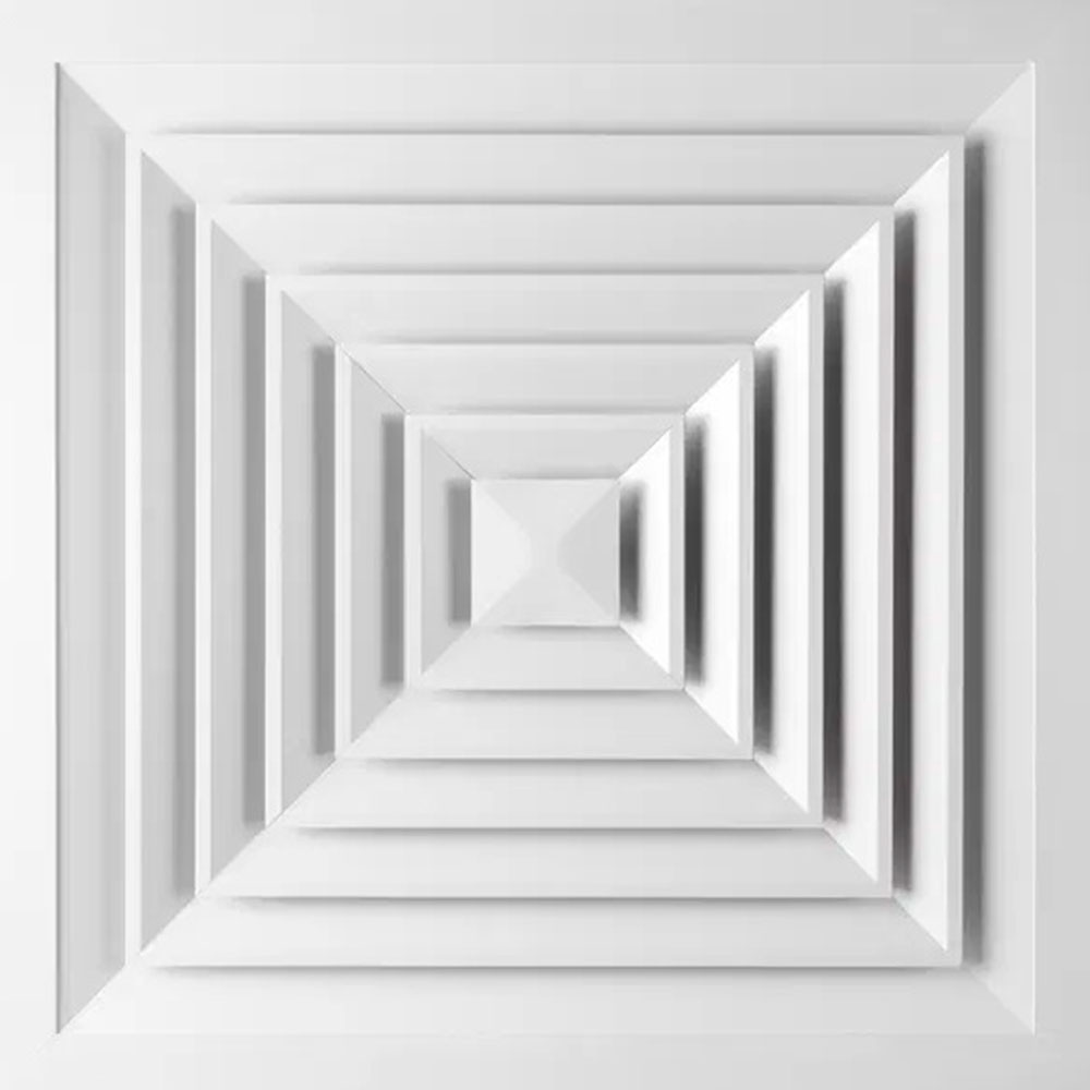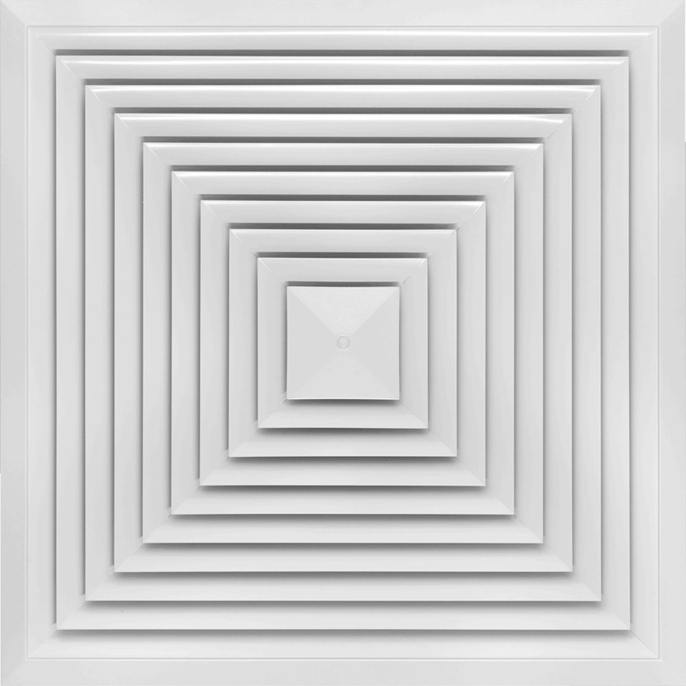 У нас в наличии и под заказ есть встраиваемые диффузоры с квадратной поверхностью рассеивателя нескольких видов, перфорированные и с фиксированными направляющими лопастями, металлические (алюминиевые).