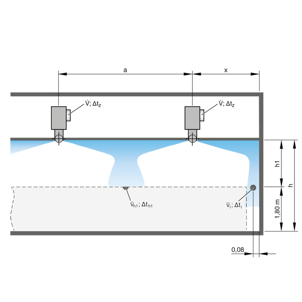 Подача воздуха осуществляется горизонтально вдоль потолка, поэтому диффузоры могут быть установлены даже в помещения с низкими потолками.