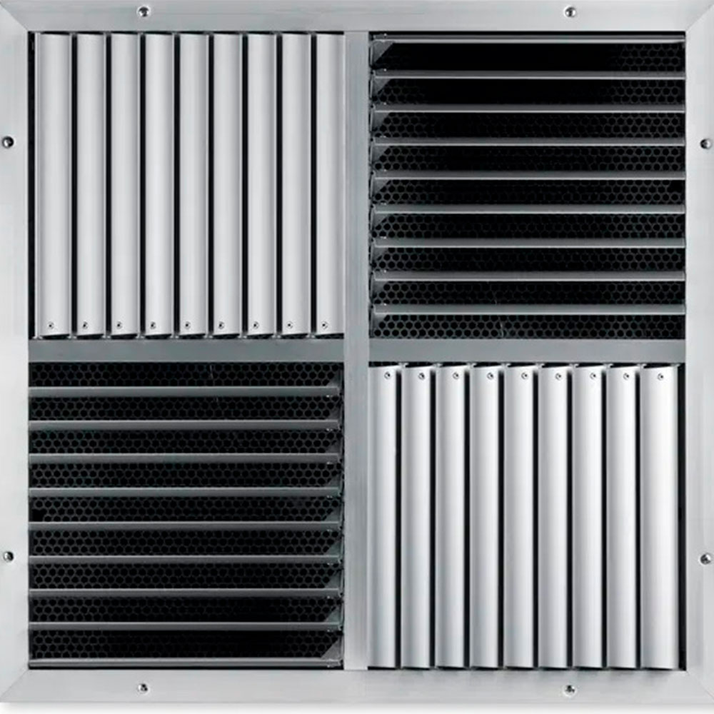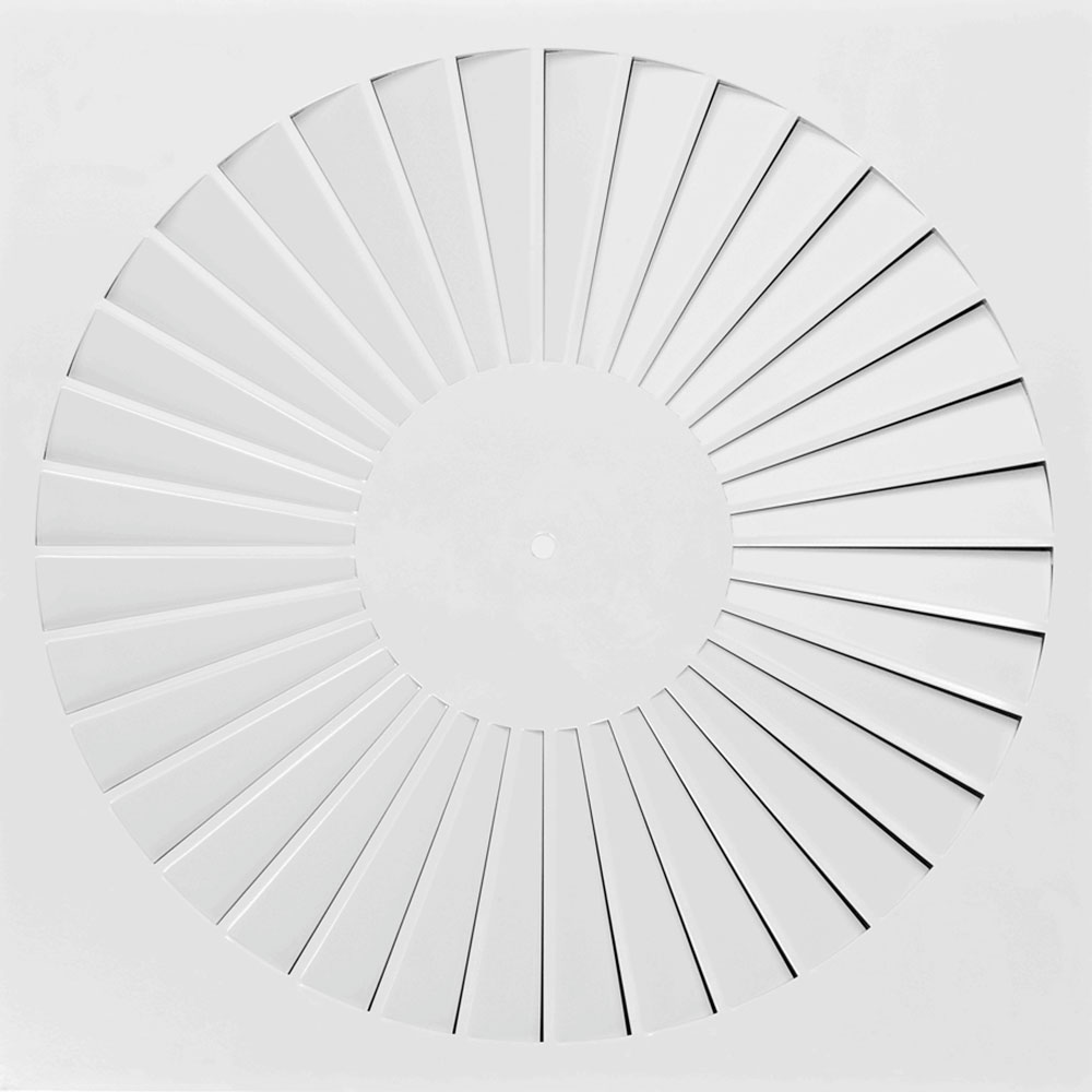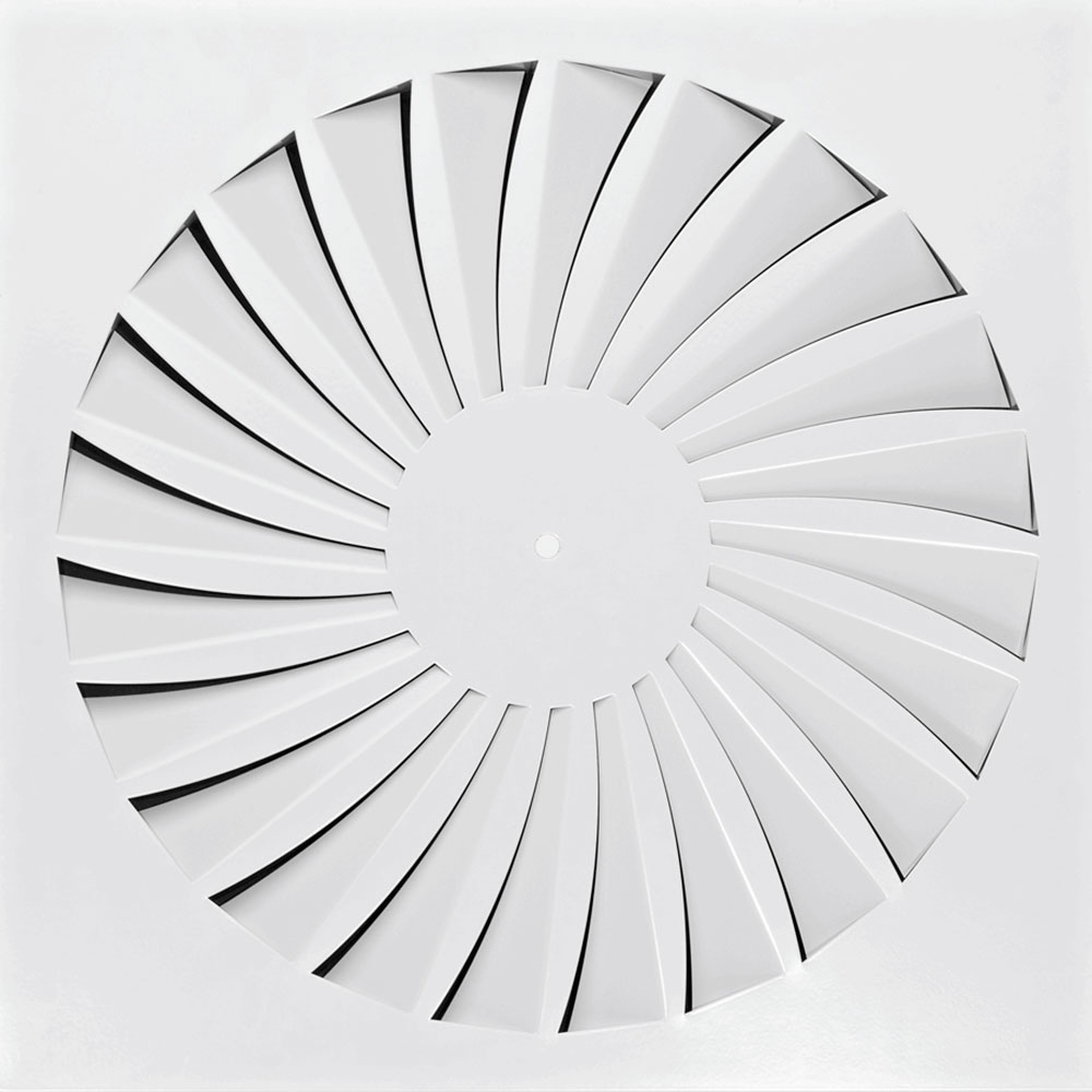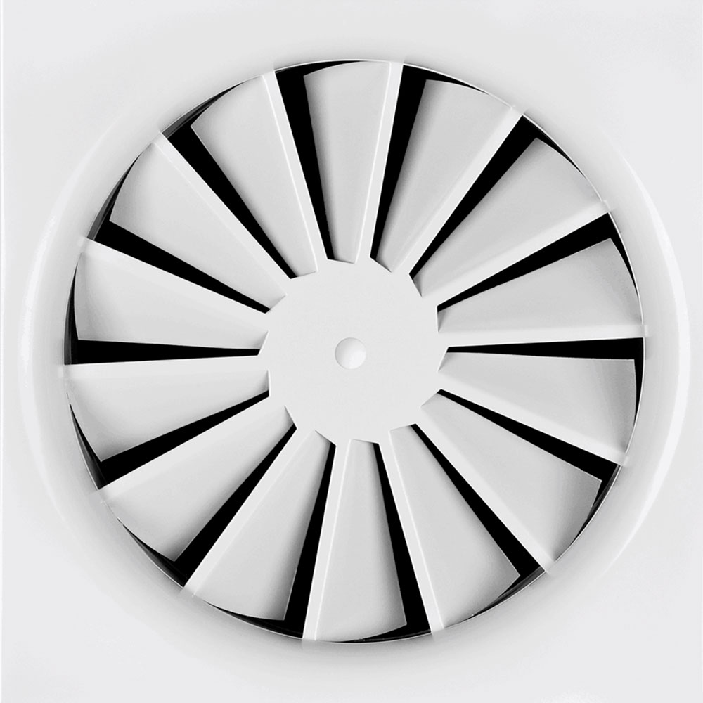 Вихревые потолочные диффузоры можно устанавливать во все типы подвесных потолков. Корпус закрепляется в двух положениях. Оборудование направляет поток воздуха в горизонтальном или вертикальном направлении с дополнительной вертикальной струей или без нее. Лопасти расположены по касательной к потолку, что усиливает подачу воздуха. Уровень шума измеряется в соответствии с EN ISO 5135.