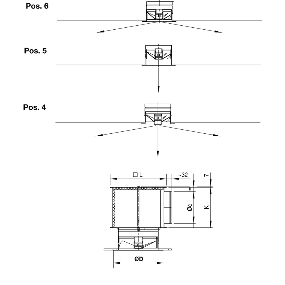 Характеристика воздухораспределения: вращающийся поток воздуха в горизонтальном или вертикальном направлении, с дополнительной вертикальной струей или без неё (достигается с помощью конического индукционного сопла, которое может быть установлено дополнительно).