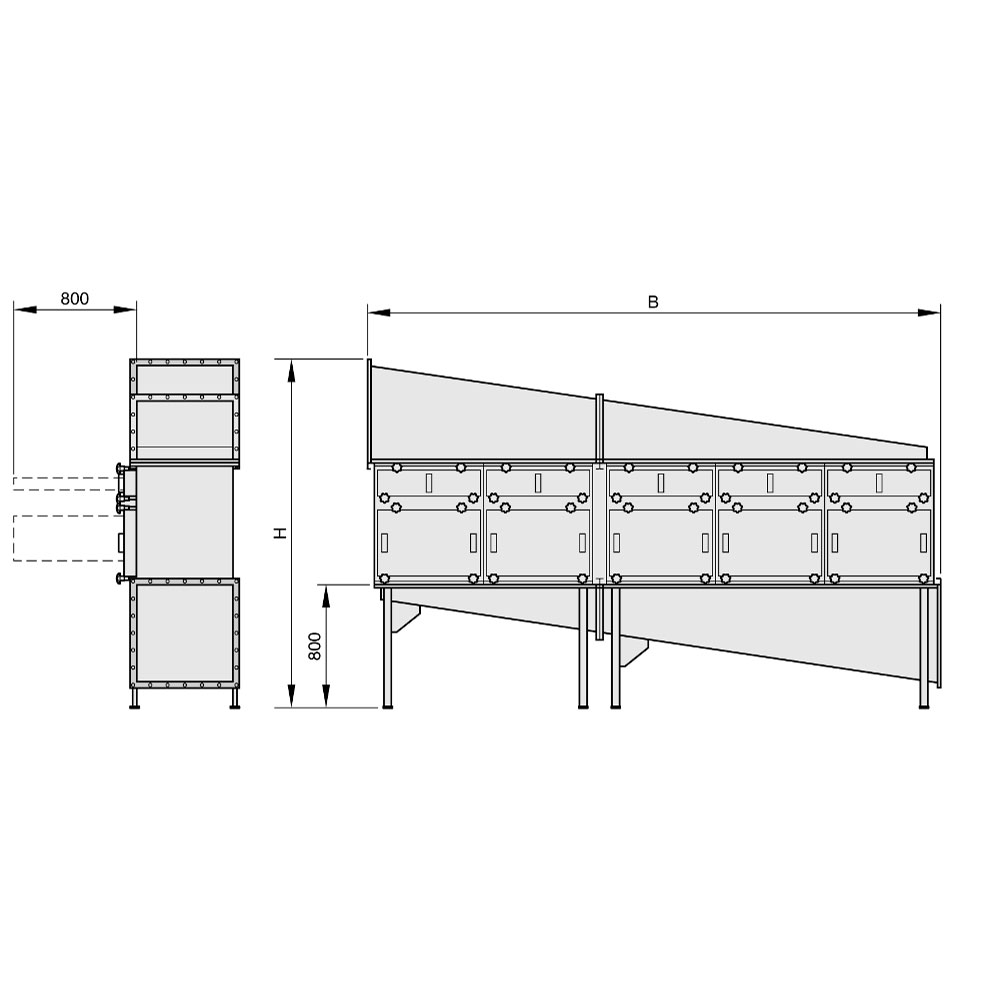 Система фильтрующих блоков, состоящая из канального сажевого фильтра типа KFS с опорными ножками для горизонтального ввода и вывода воздуха.