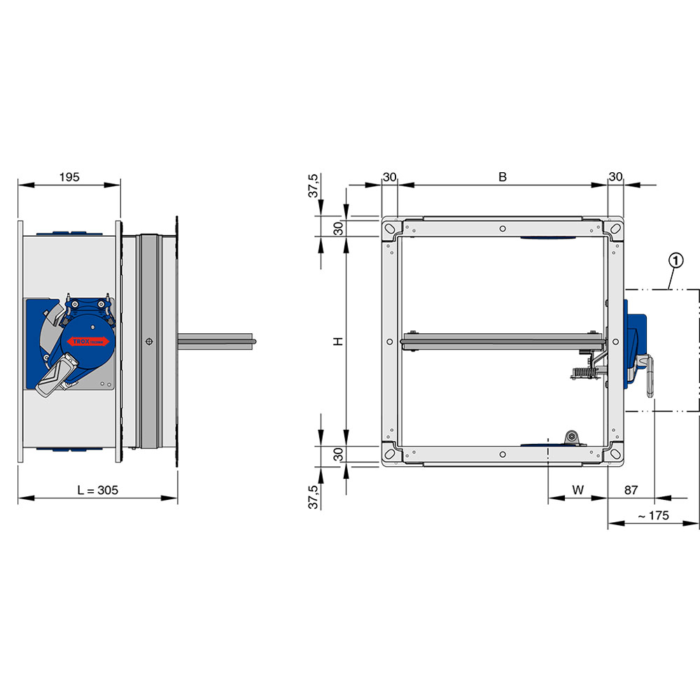 Оптимизированный герметичный корпус имеет класс герметичности C согласно DIN EN 1751 и оборудован фланцем шириной 30 мм (L = 500 мм) для присоединения к воздуховоду, изготовленному из негорючих или горючих строительных материалов. Тепловой с плавкой вставкой или термоэлектрический спусковой механизм с приводом с возвратной пружиной оснащен светодиодным индикатором состояния и кнопочным выключателем для проверки работы клапана; температура срабатывания составляет 72 °C или 95 °C (для систем вентиляции с подачей теплого воздуха).